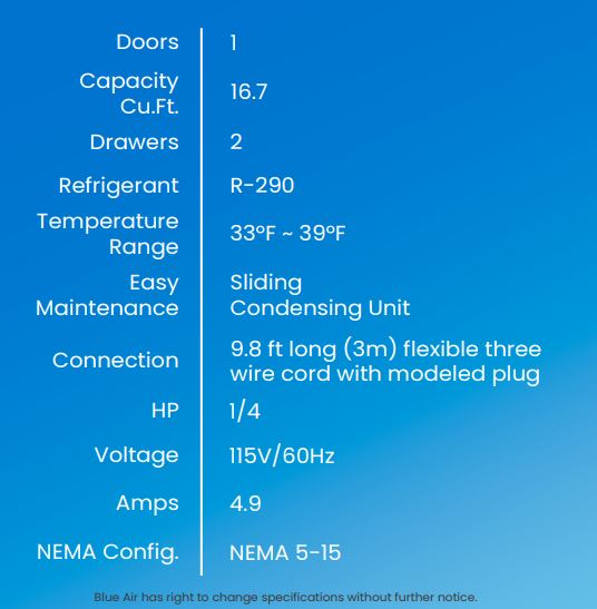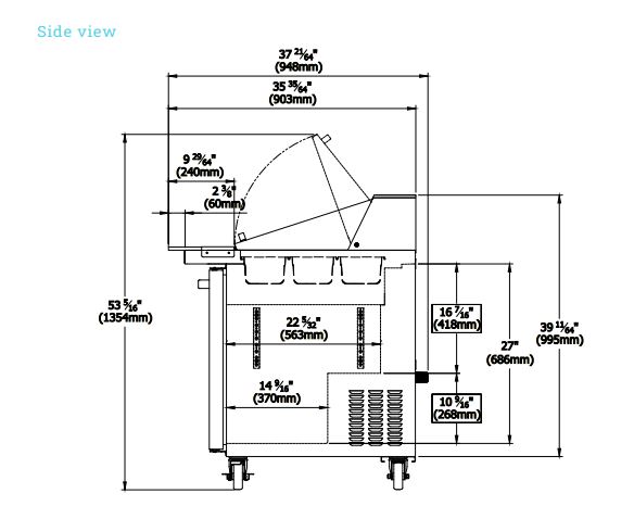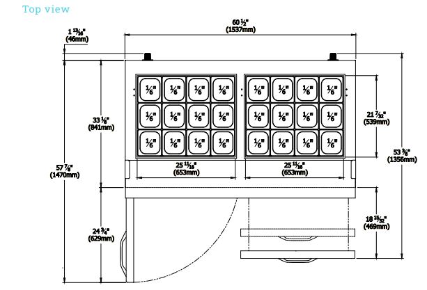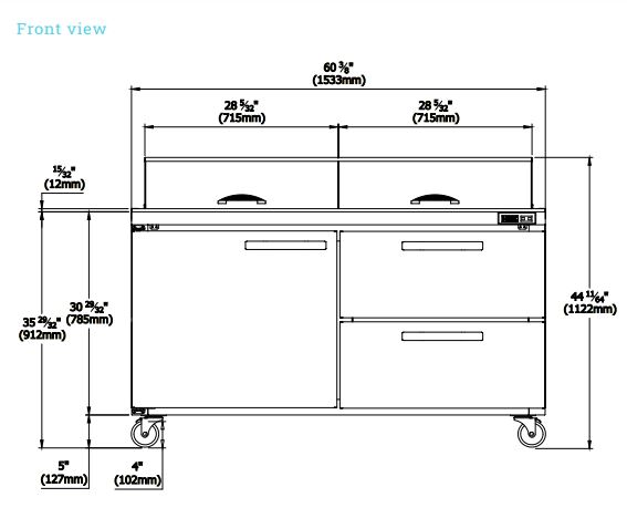 Mega Top Sandwich Prep Table, two-section, 60-3/8″W, 16.7 cu. ft. capacity, rear-mounted self-contained refrigeration, (24) 1/6 size pan capacity (included), (2) drawers, (1) self closing door(on left), (2) epoxy coated wire shelves, 9-1/2″ cutting board, side rail cutting board bracket, 33° F to 39° F temperature range, insulated pan cover with stainless steel divider, self-diagnostic digital controls & monitor system, stainless steel interior & exterior, (4) 4″ swivel casters (2 braked), R290 Hydrocarbon refrigerant, 1/4 HP, 115v/60/1-ph, 4.9 amps, cord with NEMA 5-15P, cETLus, ETL-Sanitation