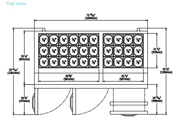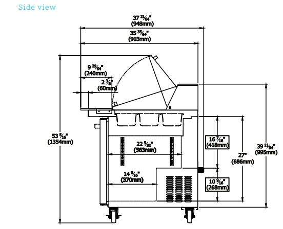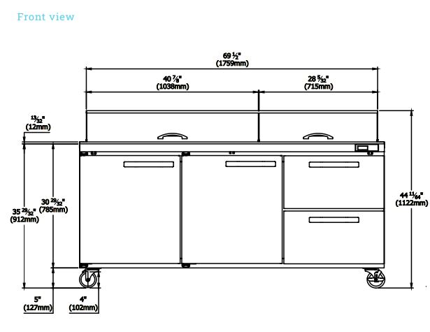 Mega Top Sandwich Prep Table, three-section, 72-3/8″W, 20.2 cu. ft. capacity, rear-mounted self-contained refrigeration, (30) 1/6 size pan capacity (included), (2) drawers, (2) self-closing swing door (on left), (2) adjustable wire shelf, 9-1/2″ cutting board, side rail cutting board bracket, 33° F to 39° F temperature range, insulated pan cover with stainless steel divider, self-diagnostic digital controls & monitor system, stainless steel interior & exterior, (4) 4″ swivel casters (2 braked), R290 Hydrocarbon refrigerant, 1/4 HP, 115v/60/1-ph, 5.4 amps, cord with NEMA 5-15P, cETLus, ETL-Sanitation