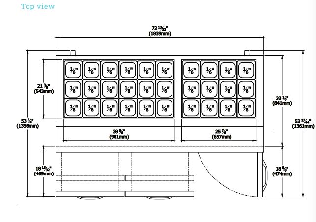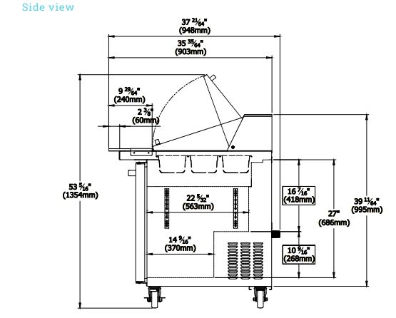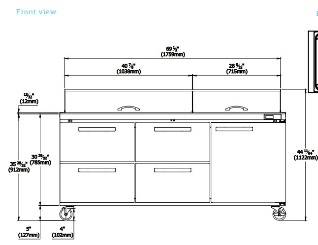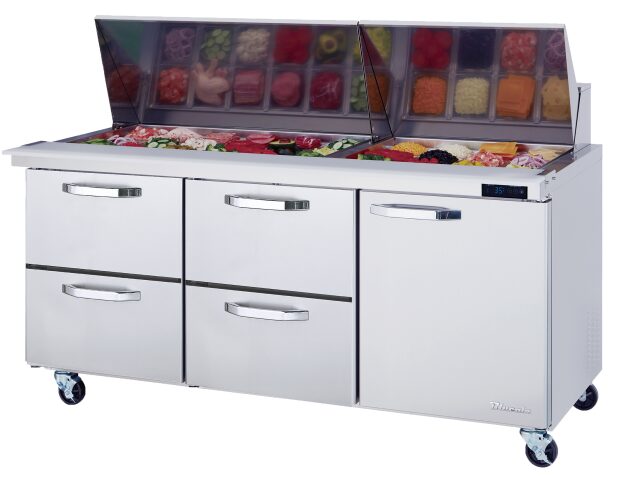 Mega Top Sandwich Prep Table, three-section, 72-3/8″W, 20.2 cu. ft. capacity, rear-mounted self-contained refrigeration, (30) 1/6 size pan capacity (included), (4) drawers, (1) self-closing swing door (on right), (1) adjustable wire shelf, 9-1/2″ cutting board, side rail cutting board bracket, 33° F to 39° F temperature range, insulated pan cover with stainless steel divider, self-diagnostic digital controls & monitor system, stainless steel interior & exterior, (4) 4″ swivel casters (2 braked), R290 Hydrocarbon refrigerant, 1/4 HP, 115v/60/1-ph, 5.4 amps, cord with NEMA 5-15P, cETLus, ETL-Sanitation