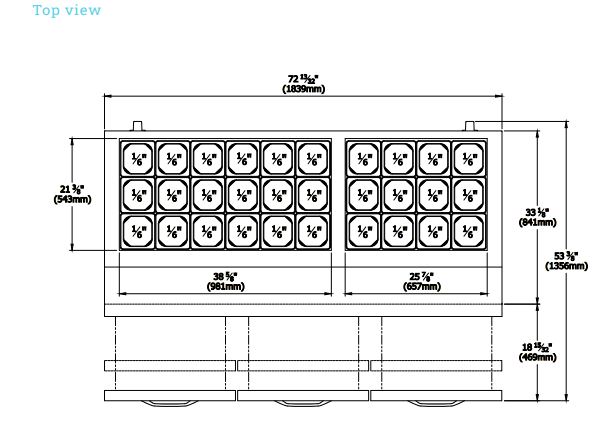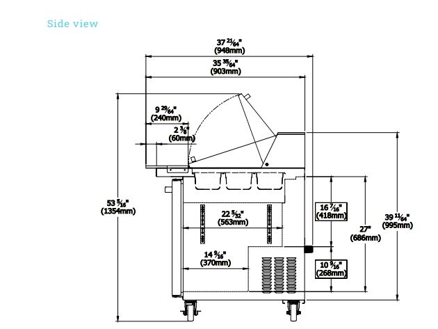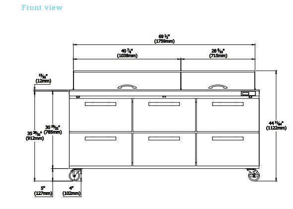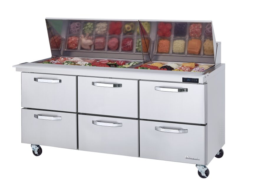 Mega Top Sandwich Prep Table, three-section, 72-3/8″W, 20.2 cu. ft. capacity, rear-mounted self-contained refrigeration, (30) 1/6 size pan capacity (included), (6) drawers, 9-1/2″ cutting board, side rail cutting board bracket, 33° F to 39° F temperature range, insulated pan cover with stainless steel divider, self-diagnostic digital controls & monitor system, stainless steel interior & exterior, (4) 4″ swivel casters (2 braked), R290 Hydrocarbon refrigerant, 1/4 HP, 115v/60/1-ph, 5.5 amps, cord with NEMA 5-15P, cETLus, ETL-Sanitation