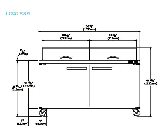 This 60 3/8″ wide prep table by Blue Air is built with stainless steel construction and galvanized steel back and bottom. With cyclopentane insulation, this unit is kept durable and cold at all times! The 1/4 HP compressor is located on the rear for easy maintenance access while the evaporator is coated with electrodeposition for improved performance and durability. It has a rounded corner design that adds to the sleek look but also decreases risks of injury.
