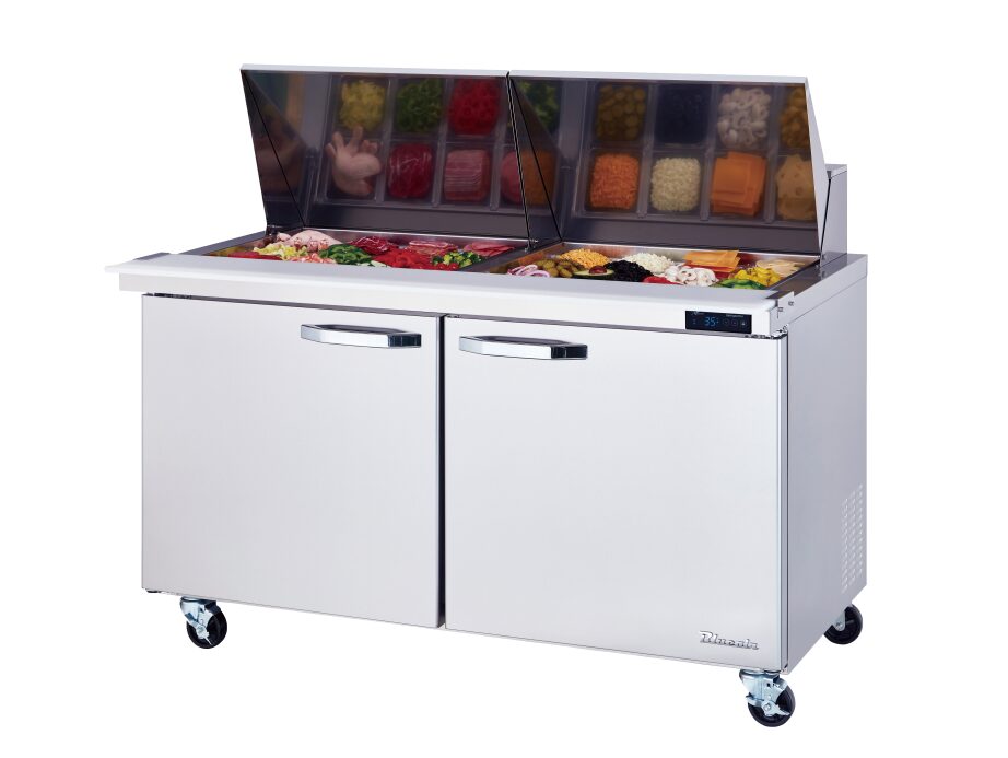Mega Top Sandwich Prep Table, two-section, 60-3/8″W, 16.7 cu. ft. capacity, rear-mounted self-contained refrigeration, (24) 1/6 size pan capacity (included), (2) self-closing swing doors, (2) adjustable wire shelves, 9-1/2″ cutting board, side rail cutting board bracket, 33° F to 39° F temperature range, insulated pan cover with stainless steel divider, stainless steel interior & exterior, (4) 4″ swivel casters (2 braked), R290 Hydrocarbon refrigerant, 1/4 HP, 115v/60/1-ph, 4.9 amps, cord with NEMA 5-15P, cETLus, ETL-Sanitation
