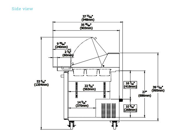 The Blue Air BLMT60-HC Mega Top Sandwich Prep Table comes with three rows of 24 1/6 size food pans at 4″ deep, but this unit can accommodate 6″ deep pans so you can refrigerate more in the same space. Pull down the insulated pan covers with stainless steel divider over the food items to protect from spoilage.