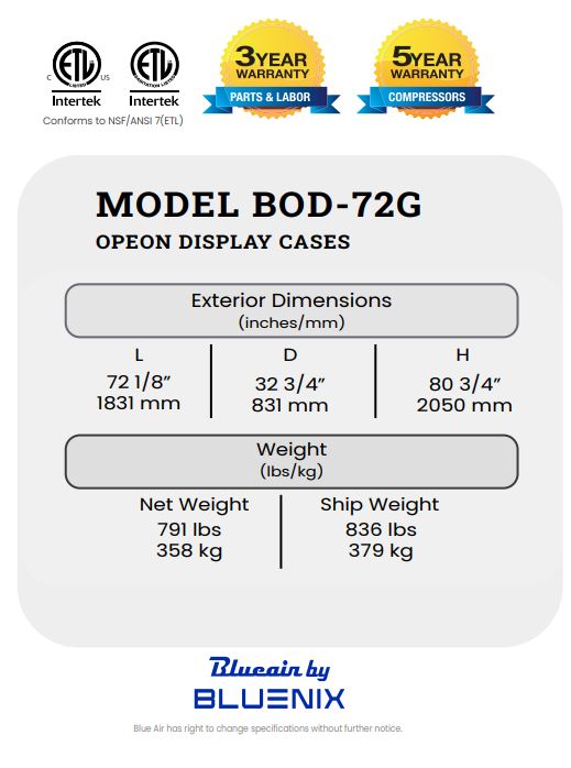The BOD-72G Open Display Case has an Energy Star rating and is cETLus and ETL-Sanitation certified for guaranteed safe commercial use. It is rated at 15 amps and uses a 115~220V/ 60Hz electrical connection with NEMA L14-20 plugging.