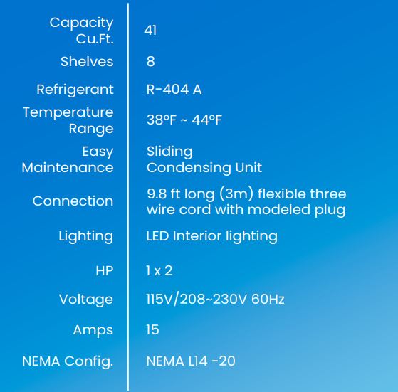 With a commitment to environment-friendly commercial refrigeration, Blue Air uses an R404A refrigerant with low ozone depletion potential to cool the contents without a negative impact on the environment. The temperature is kept below 50° F to offer versatile cooling needs.