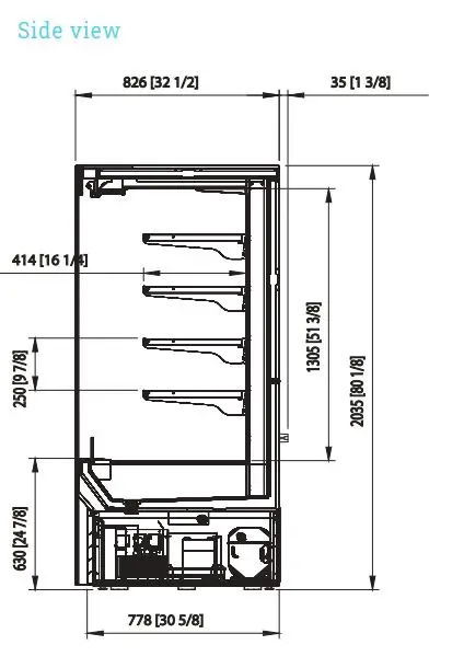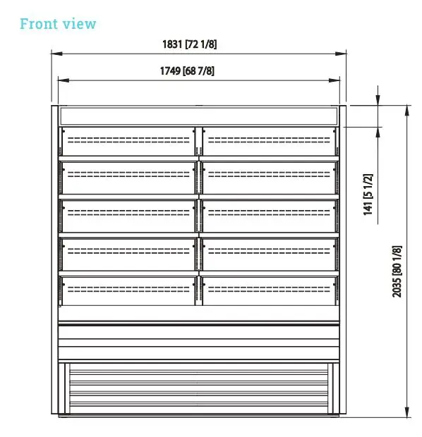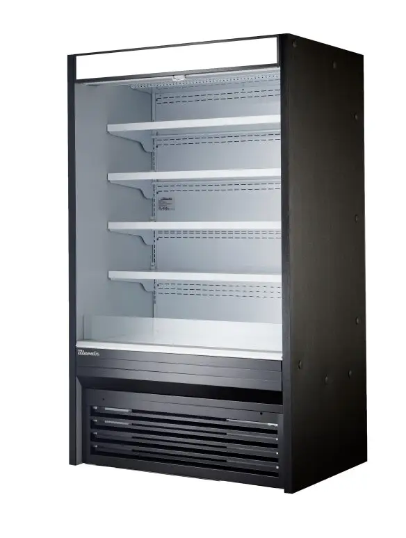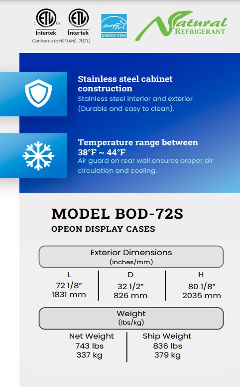 Open Display Case, 72-1/16″W, 41.0 cu. ft. capacity, bottom mount self-contained refrigeration, open front, solid side panels, (4) adjustable shelves, LED interior lighting, rear air guard, night curtain, pre-coated steel exterior, non-peel powder-coated steel interior, 1HP, 115-230v/60/1-ph, NEMA L14-20P, cUL, UL, ETL-Sanitation