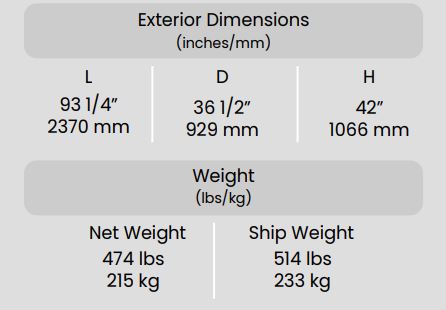 Exterior Dimensions ( L x D x H ) 93 1/4 x 36 1/2 x 42 inch