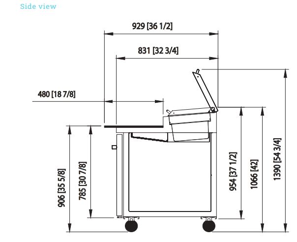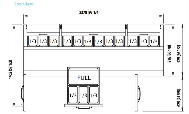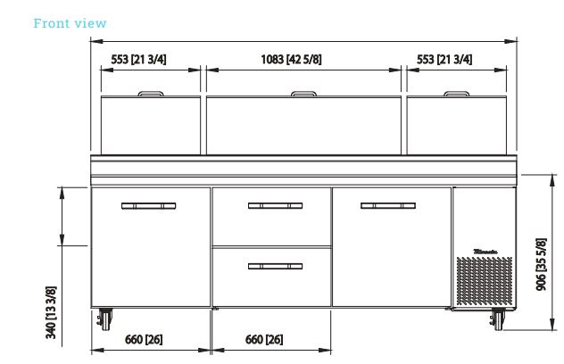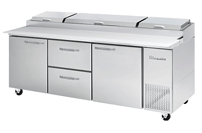 Pizza Prep Table, three-section, 93-1/4″W, 30.8 cu. ft. capacity, side-mounted self-contained refrigeration, (2) drawers (in middle), (2) door (in middle and right), (2) adjustable wire shelves, accommodates (12) 1/3 size pans, insulated pan cover with stainless steel divider, 33°-39°F temperature range, 19″D cutting board, stainless steel interior & exterior, 4″H swivel casters (2 braked), R290 Hydrocarbon refrigerant, 3/8 HP, 115v/60/1-ph, 3.5 amps, cord, NEMA 5-15P, cUL, UL, ETL-Sanitation