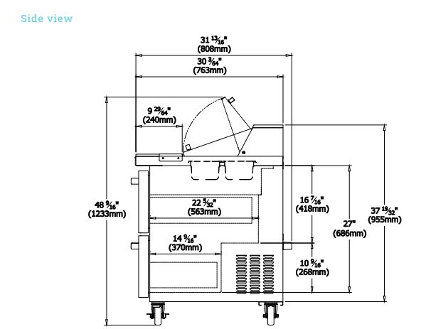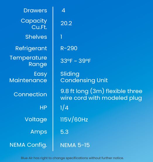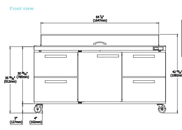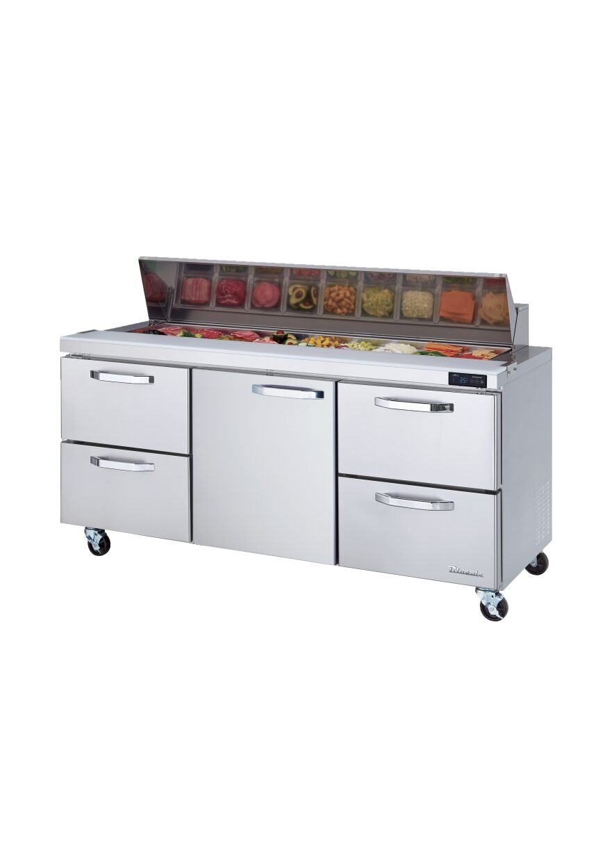 Sandwich Prep Table, three-section, 72-3/8″W, 20.2 cu. ft. capacity, rear-mounted self-contained refrigeration, (18) 1/6 size pan capacity (included), (4) drawers, (1) self-closing swing door (in middle), (1) adjustable wire shelf, 9-1/2″ cutting board, side rail cutting board bracket, 33° F to 39° F temperature range, insulated pan cover with stainless steel divider, self-diagnostic digital controls & monitor system,, stainless steel interior, stainless steel exterior (galvanized steel back & bottom), (4) 4″ swivel casters (2 braked), R290 Hydrocarbon refrigerant, 1/4 HP, 115v/60/1-ph, 5.3 amps, cord with NEMA 5-15P, cETLus, ETL-Sanitation