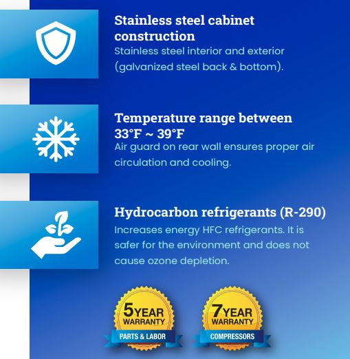 This refrigerated compartment is concealed behind two (2) lifetime guaranteed doors that are constructed with heavy-duty metal for excellent durability. They are also self-closing to avoid the risk of accidentally leaving them open when retrieving and loading items, especially during busy hours. As a precaution, a visual and audible alarm also activates when the doors are not completely closed after use to prevent cold air from escaping and the food from spoiling.