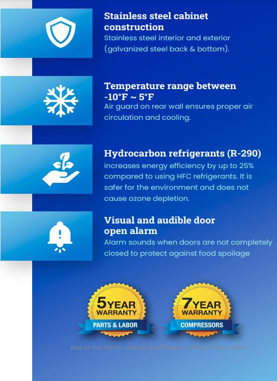 With the Blue Air BSF23T-HC Freezer, refrigeration shouldn’t be hard on your budget and the environment! From the rigid cyclopentane insulation and durable and easy-to-clean gaskets to the R-290 refrigerant and innovative hot gas frame heating system, this unit is not only more energy-efficient but also easier on the ozone layer. A rear wall air guard ensures proper air circulation and cooling while a rear-mounted condensation pan improves ventilation and prevents water flow.