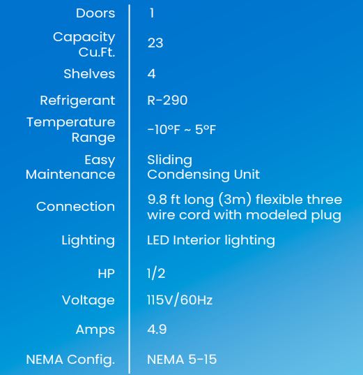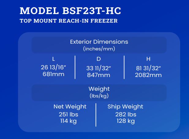 The Blue Air BSF23T-HC Freezer has an Energy Star rating with cETLus and ETL-Sanitation certifications. This unit is rated at 4.9 amps and requires a 115V/60Hz electrical connection with NEMA 5-15P plugging. Additional features include additional shelves, 6″ adjustable legs, and 2.5″ casters.