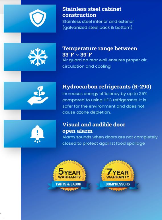 For speedy service and convenience, the two (2) doors have metal handles and pressure relievers for easy opening. They also automatically close at 90° or less to avoid leaving it ajar especially during your busiest hours where operators will come and go. The doors also stay open at 110° so that you can load and retrieve items without hassle. The unit has a visual and audible alarm to notify when the doors are not completely closed to avoid straining the refrigeration system and losing cold air.