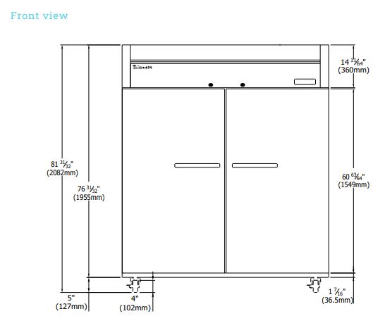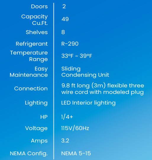Refrigerator, reach-in, two-section, 49 cu. ft. capacity, top-mounted self-contained refrigeration, (2) full-size self-closing solid doors (locking), metal door handles, door open alarm, (8) adjustable wire shelves, digital controls, LED interior lighting, stainless steel interior & exterior, 4″ swivel casters (2 braked), R290 Hydrocarbon refrigerant, 1/4 HP, 115v/60/1-ph, 3.2 amps, cord with NEMA 5-15P, cETLus, ETL-Sanitation, ENERGY STAR®