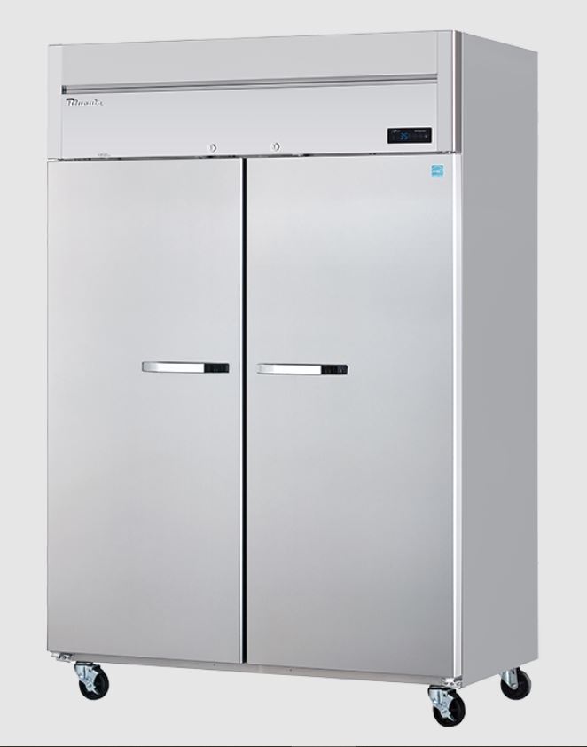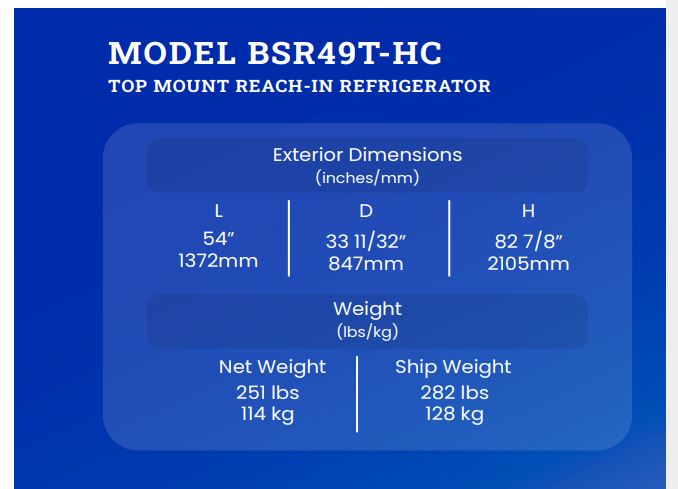 This Blue Air BSR49T-HC Refrigerator packs a 1/4 HP compressor at the top to unlock more interior space and avoid clogging. Operating at a temperature range of 33-39ºF, the unit adds 49 cubic ft. of frozen storage to your kitchen. A total of eight (8) adjustable shelves are included so you can customize the space to your needs. Plus, with a depth of 31″, this unit is designed to accept a roll-in rack of full-size bun sheet pans! There’s LED lighting inside for maximum product visibility for less energy consumption. The doors are also lockable to keep your food products safe from theft.