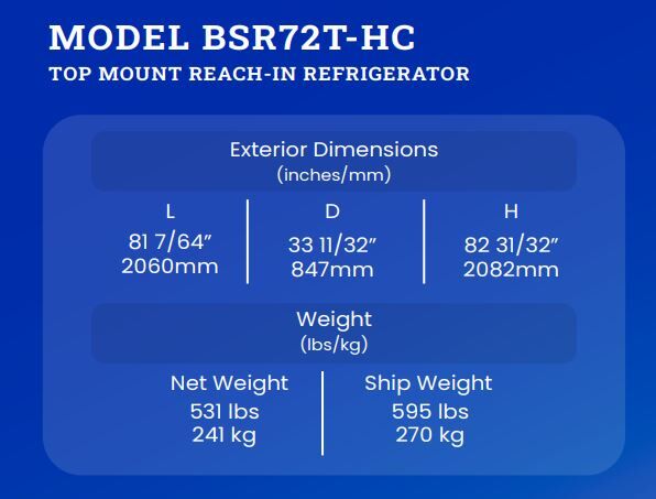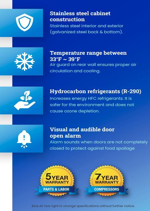 This Blue Air BSR72T-HC Refrigerator packs a 1/2 HP compressor at the top to unlock more interior space and avoid clogging. Operating at a temperature range of 33-39ºF, the unit adds 72 cubic ft. of frozen storage to your kitchen. A total of 12 adjustable shelves are included so you can customize the space to your needs. Plus, with a depth of 31″, this unit is designed to accept a roll-in rack of full-size bun sheet pans! There’s LED lighting inside for maximum product visibility for less energy consumption. The doors are also lockable to keep your food products safe from theft.