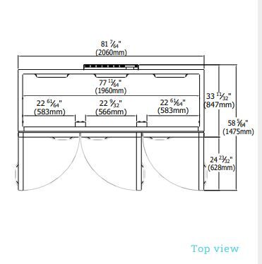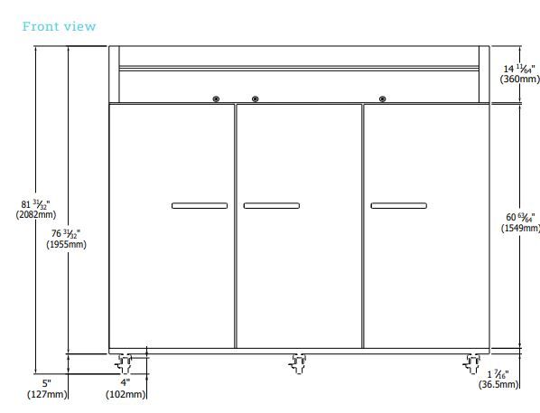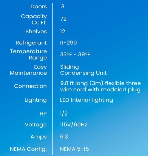 Refrigerator, reach-in,three-section, 72 cu. ft. capacity, top-mounted self-contained refrigeration, (3) full-size solid self-closing doors (locking), metal door handles, door open alarm, (12) adjustable wire shelves, digital controls, LED interior lighting, stainless steel interior & exterior, 4″ swivel casters (2 braked), R290 Hydrocarbon refrigerant, 1/2 HP, 115v/60/1-ph, 6.3 amps, cord with NEMA 5-15P, cETLus, ETL-Sanitation, ENERGY STAR®