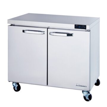 Two-section, 36-3/8″W, 9.5 cu. ft. capacity, rear-mounted self-contained refrigeration, -10° to 0°F temperature range, (2) self-closing swing door, metal door handle, open door alarm, (4) adjustable wire shelves, self-diagnostic digital temperature control & monitor system, stainless steel interior & exterior, (4) 4″ swivel casters (2 braked), R290 Hydrocarbon refrigerant, 1/2 HP, 115v/60/1-ph, 5.2 amps, cord with NEMA 5-15P, cETLus, ETL-Sanitation