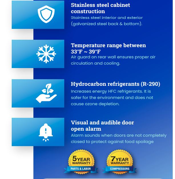 This unit provides the ideal preservation environment for your inventory with a temperature range of 33-39°F. Blue Air boosts the performance with an evaporator that has electrodeposition coating for consistent heat transfer and added durability as well as an innovative hot gas frame heating system that minimizes condensation and increases energy efficiency.