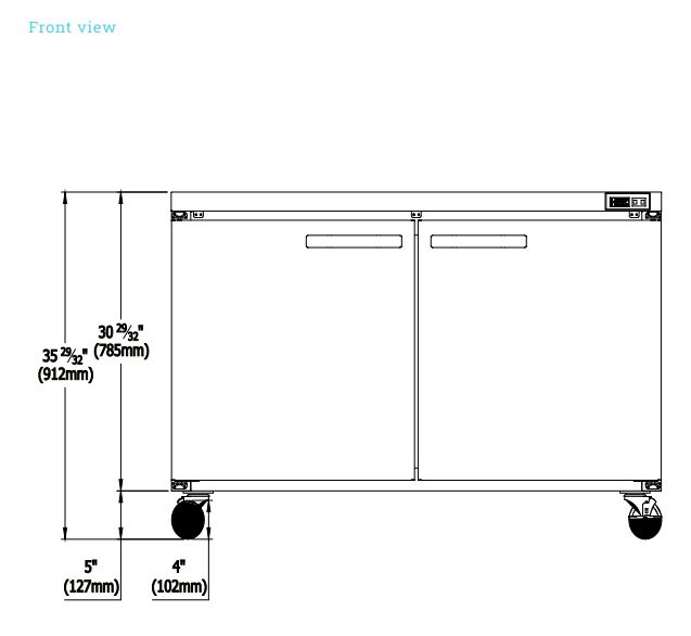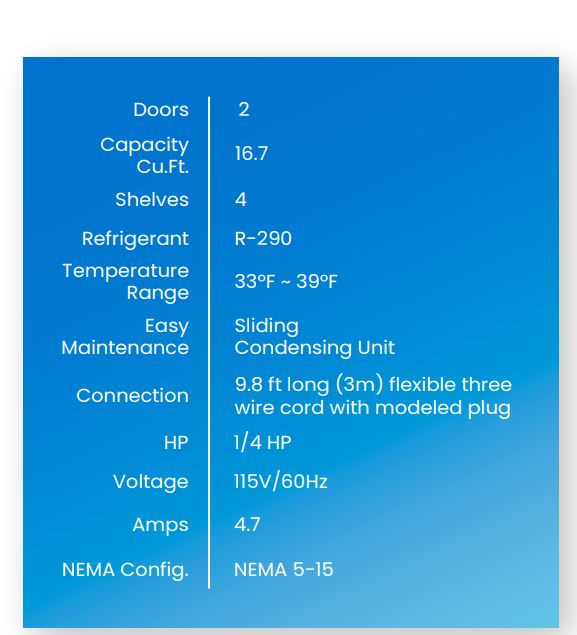 Two-section, 60-3/8″W, 16.7 cu. ft. capacity, rear-mounted self-contained refrigeration, 33° F to 39° F temperature range, (2) self-closing swing doors, metal door handles, open door alarm, (4) adjustable wire shelves, self-diagnostic digital temperature control & monitor system, stainless stainless steel interior & exterior, (4) 4″ swivel casters (2 braked), R290 Hydrocarbon refrigerant, 1/4 HP, 115v/60/1-ph, 4.7 amps, cord with NEMA 5-15P, cETLus, ETL-Sanitation, ENERGY STAR®
