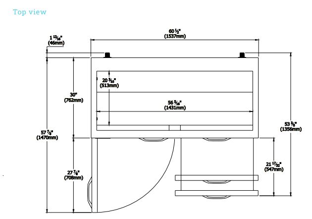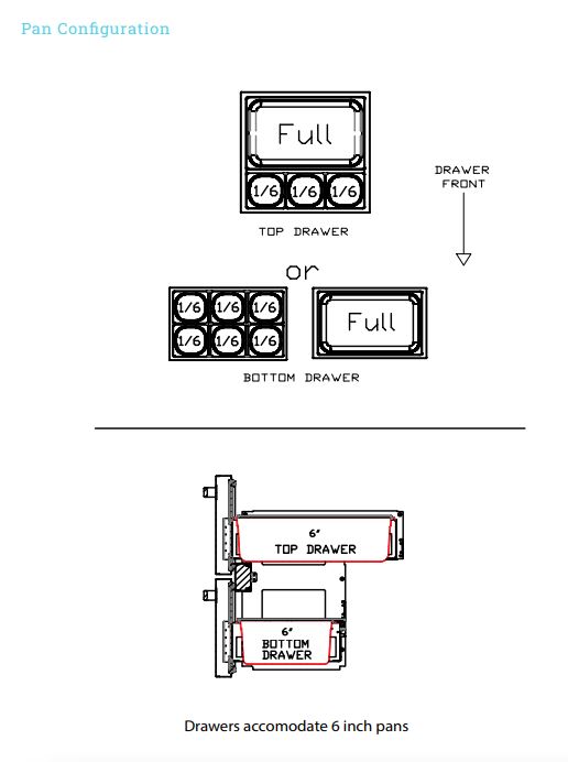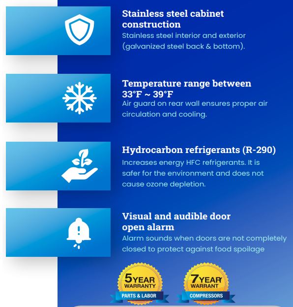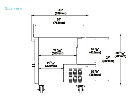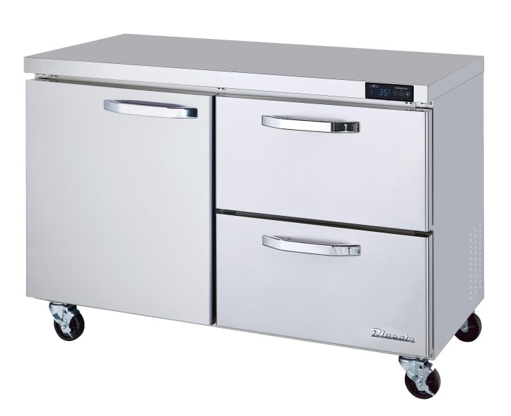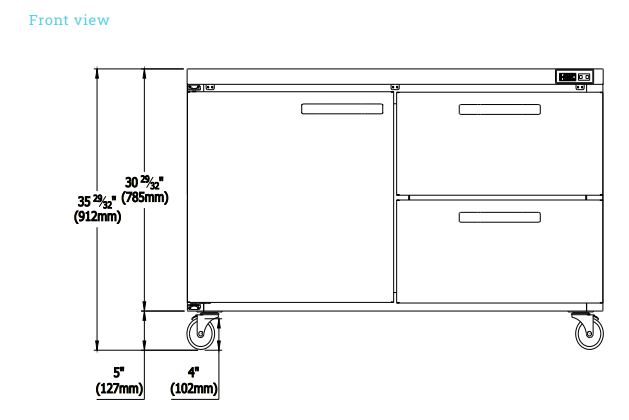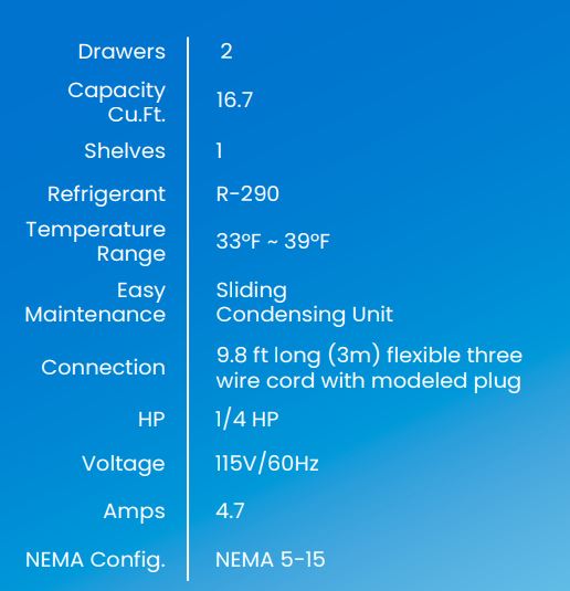 Two-section, 60-3/8″W, 16.7 cu. ft. capacity, rear-mounted self-contained refrigeration, 33° F to 39° F temperature range, (2) drawers, metal drawer handles, (1) door with epoxy coated wire shelves, left hand side, self-diagnostic digital temperature control & monitor system, stainless stainless steel interior & exterior, (4) 4″ swivel casters (2 braked), R290 Hydrocarbon refrigerant, 1/4 HP, 115v/60/1-ph, 5.0 amps, cord with NEMA 5-15P, cETLus, ETL-Sanitation