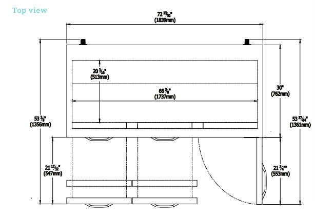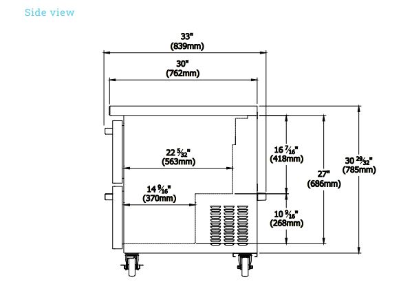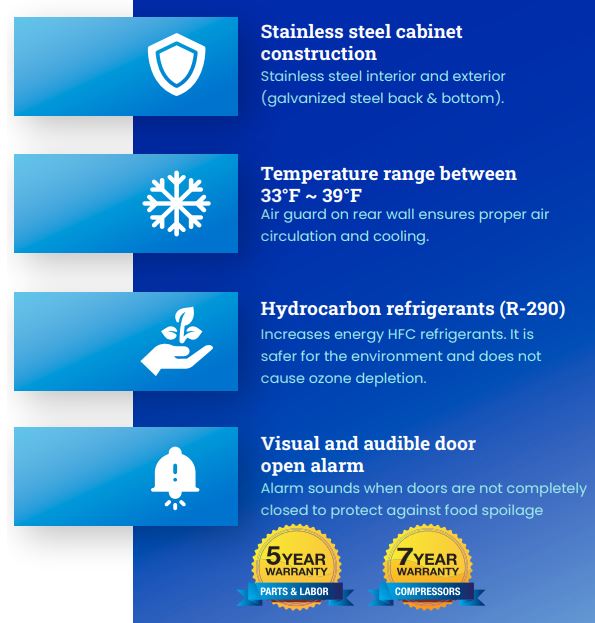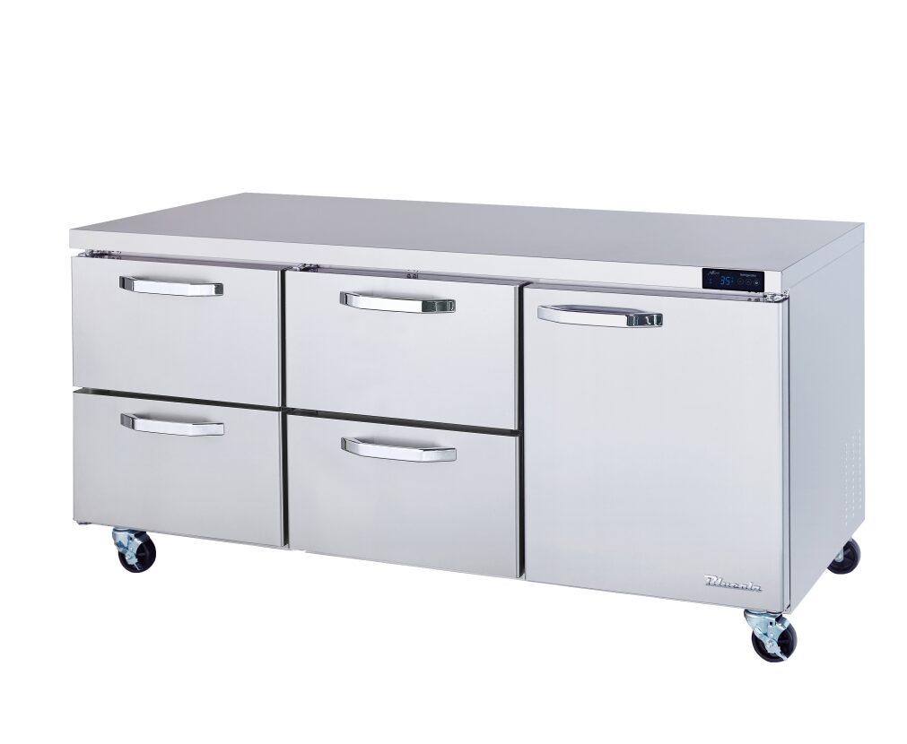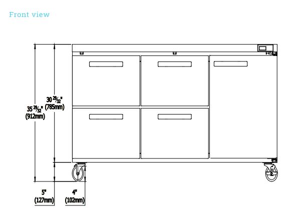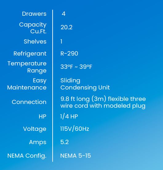 Three-section, 72-3/8″W, 20.2 cu. ft. capacity, rear-mounted self-contained refrigeration, 33° F to 39° F temperature range, (4) drawers, metal drawer handles, (1) self-closing swing door (on right), metal door handle, open door alarm, (2) adjustable wire shelves, self-diagnostic digital temperature control & monitor system, stainless stainless steel interior & exterior, (4) 4″ swivel casters (2 braked), R290 Hydrocarbon refrigerant, 1/4 HP, 115v/60/1-ph, 5.2 amps, cord with NEMA 5-15P, cETLus, ETL-Sanitation
