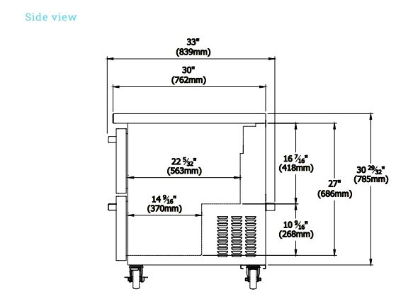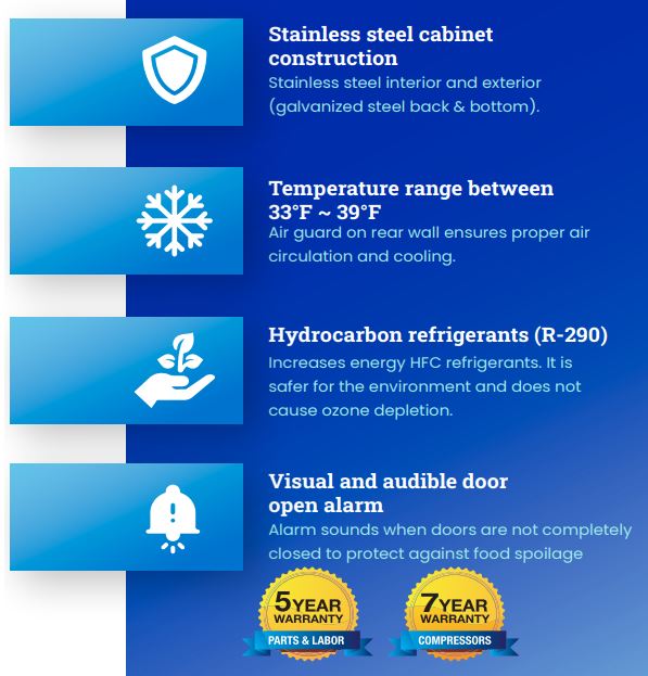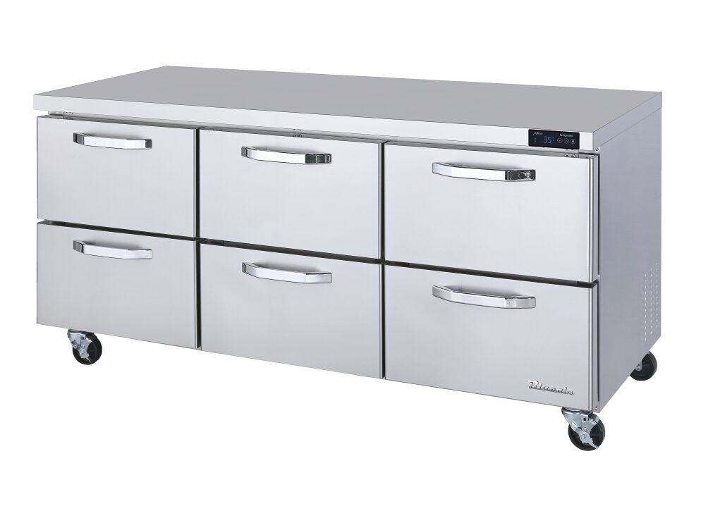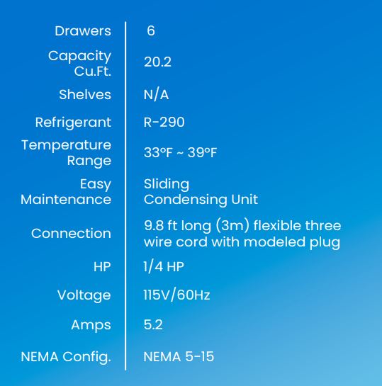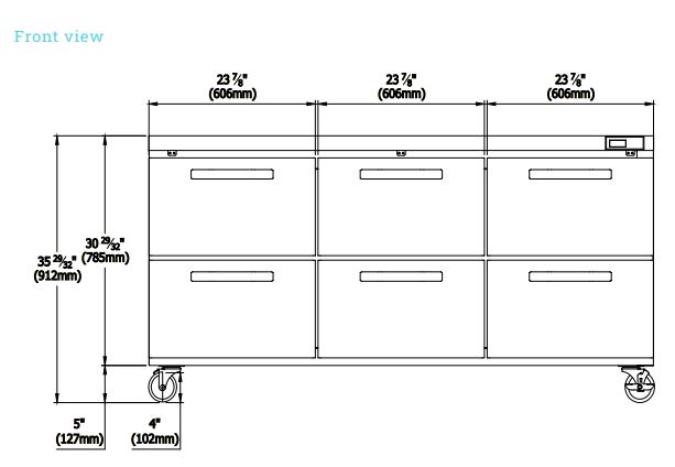 Three-section, 72-3/8″W, 20.2 cu. ft. capacity, rear-mounted self-contained refrigeration, 33° F to 39° F temperature range, (6) drawers, metal drawer handles, self-diagnostic digital temperature control & monitor system, stainless stainless steel interior & exterior, (4) 4″ swivel casters (2 braked), R290 Hydrocarbon refrigerant, 1/4 HP, 115v/60/1-ph, 5.0 amps, cord with NEMA 5-15P, cETLus, ETL-Sanitation