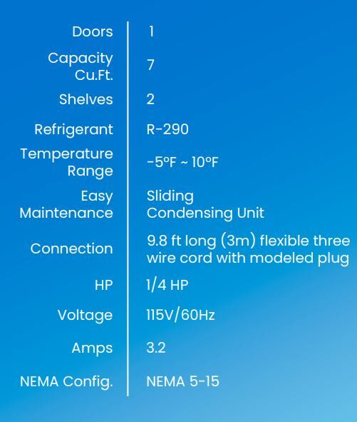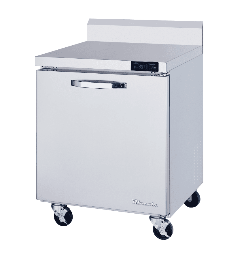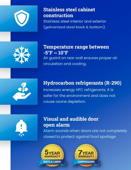 The Blue Air Worktop Freezer BLUF28-WT-HC is a compact, efficient commercial freezer with a 7.0 cubic feet capacity and a temperature range of -10°F to 5°F. Constructed from durable stainless steel, it features high-density polyurethane insulation for energy efficiency. Key highlights include a self-closing door, adjustable epoxy-coated wire shelves, an integrated cutting board, and mobility with swivel casters. Using eco-friendly hydrocarbon refrigerant (R-290), this NSF/ANSI Standard 7 compliant unit comes with a 5-year parts and labor warranty and a 7-year compressor warranty, making it an excellent choice for commercial kitchens.