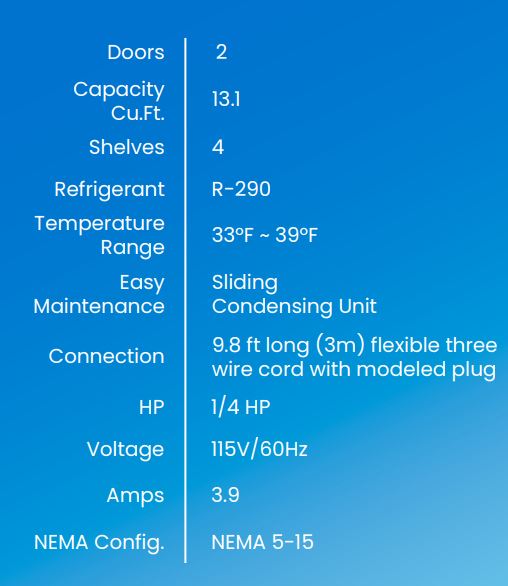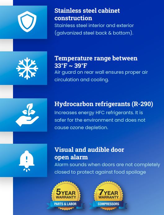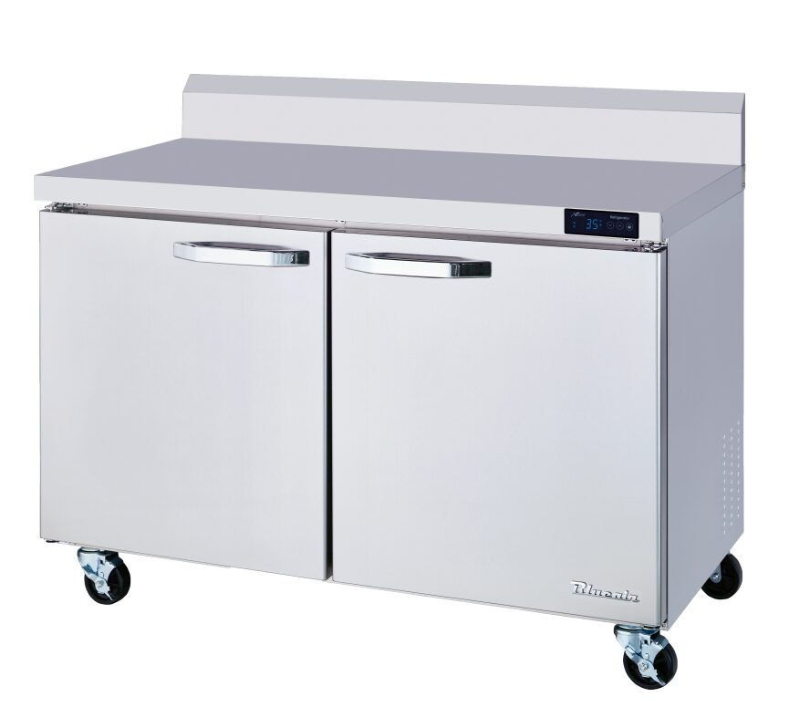 The Blue Air Worktop Refrigerator BLUR48-WT-HC is a versatile and efficient refrigeration solution designed for commercial kitchens. With a stainless steel construction, it features a two-door design and a spacious 13.0 cu. ft. capacity, accommodating both 4″ and 6″ deep pans (not included). The unit utilizes hydrocarbon refrigerants (R-290) for enhanced energy efficiency and operates within a temperature range of 33°F to 39°F. Its self-closing doors, durable gaskets, and heavy-duty metal handles ensure reliability and ease of use. Additionally, the refrigerator is compliant with NSF/ANSI Standard 7, making it suitable for food storage in professional settings