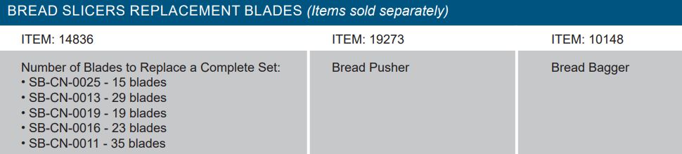 The slicer performs an excellent job in bakeries, or deli operations. It is a high performance machine that takes up very little counter space. Various cutting widths are available. Standard sizes are 1″, 1/2″, 3/4″, 5/8″, and 7/16″. Ideal for bakery shops, hotels, delis, and various food service operations. Can slice loaves to a maximum of 15″ long and 6″ high. Heavy duty poly pusher and stainless steel bagger included.