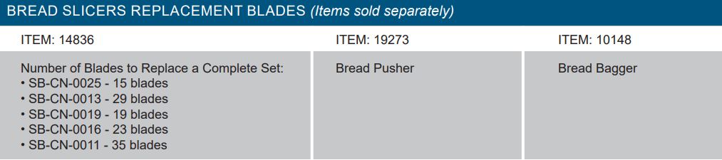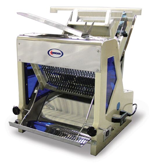 The slicer performs an excellent job in bakeries, or deli operations. It is a high performance machine that takes up very little counter space. Various cutting widths are available. Standard sizes are 1″, 1/2″, 3/4″, 5/8″, and 7/16″. Ideal for bakery shops, hotels, delis, and various food service operations. Can slice loaves to a maximum of 15″ long and 6″ high. Heavy duty poly pusher and stainless steel bagger included.