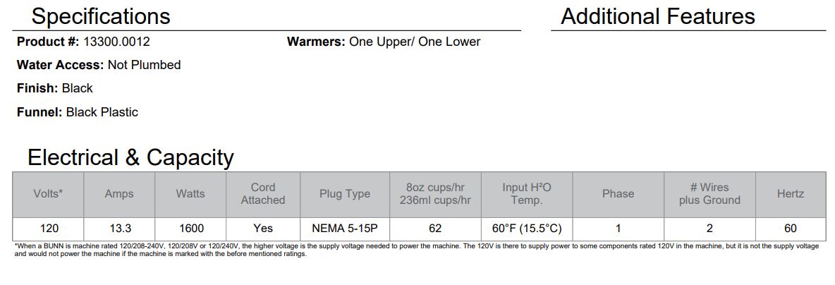 Electrical Configuration: 120 volts / 1600 watts / 13.3 amps / 1 phase / 60 hertz / 2 wire