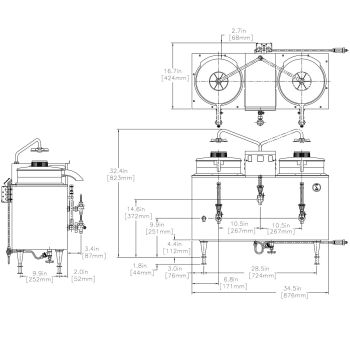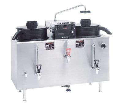 This BUNN U3 coffee urn (20500.0000) has two coffee faucets, enabling it to produce and dispense two different brews. It holds warm coffee in its two 3-gallon reservoirs, eliminating the need for a pot, and the reservoir design reduces evaporation so the flavor stays strong. If electronic components need repair, they are accessible from the top, and this brewer is made of durable, corrosion-resistant stainless steel and has plastic brew funnels.