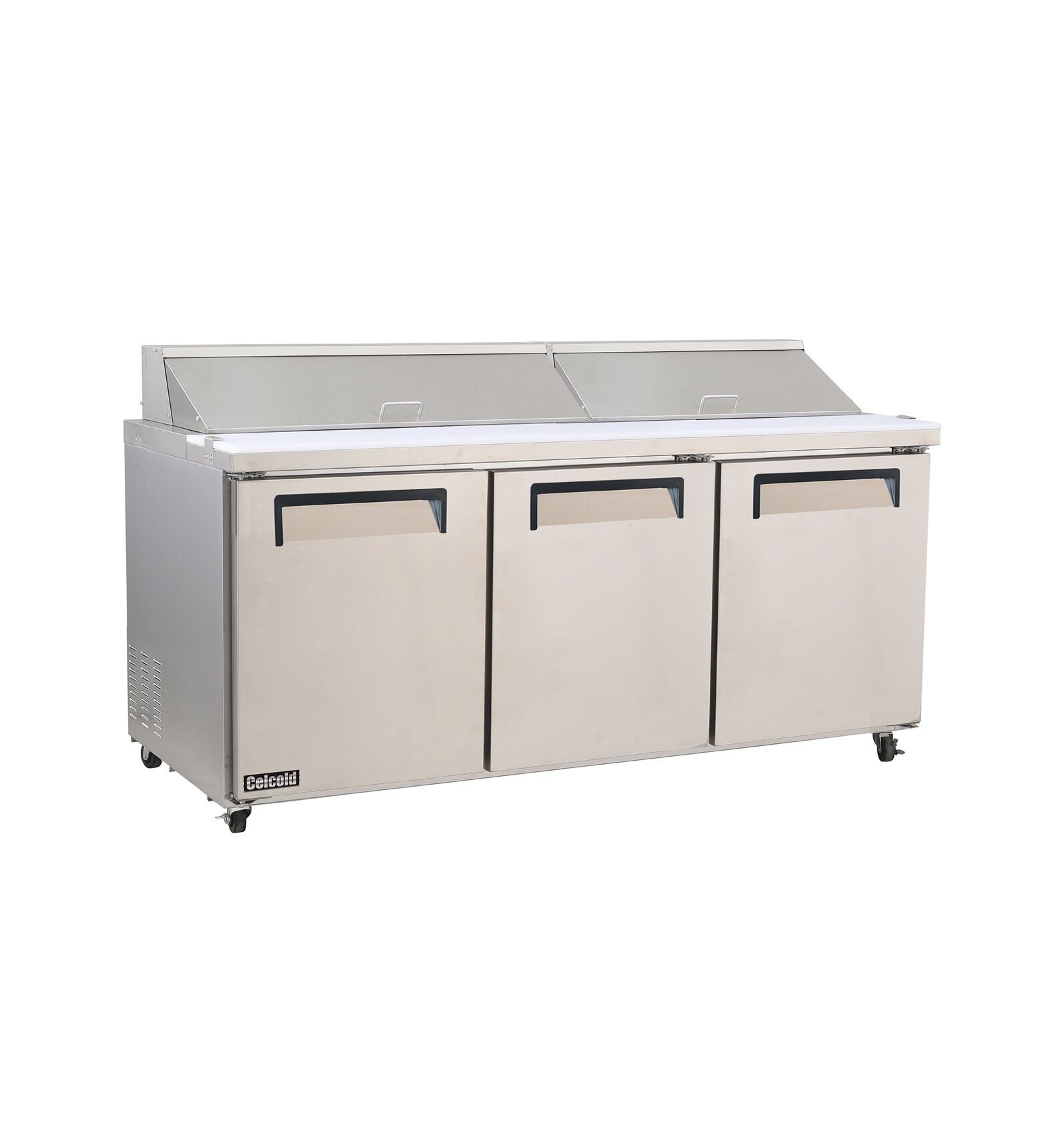 With extra space of additional pans, these refrigerated Sandwich/Salad prep tables are essential for any restaurant with multi ingredient dishes. The pan set up allows for complex arrangement and organization of a wide variety of toppings. The refrigeration helps ingredients stay fresh and prevent bottle necks at the walk in cooler. The sturdy stainless steel construction and wheels make them dynamic and durable for the modern fast pace kitchen. With a large cutting board countertop these tables have everything needed to create stunning dishes.