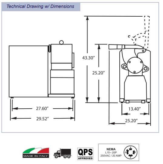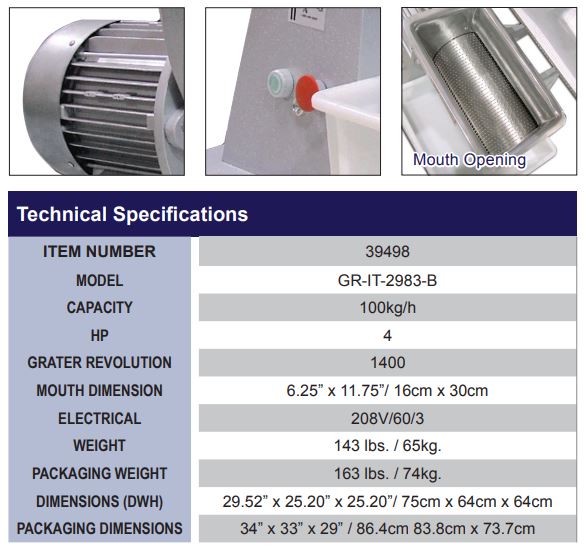 This heavy-duty model allows for easy grating of hard cheese and stale breads. Comes with a long lasting stainless steel roller and is equipped with a break motor. Self-cooled motor for high performance and continuous use. Shipped on Pallet.