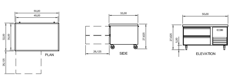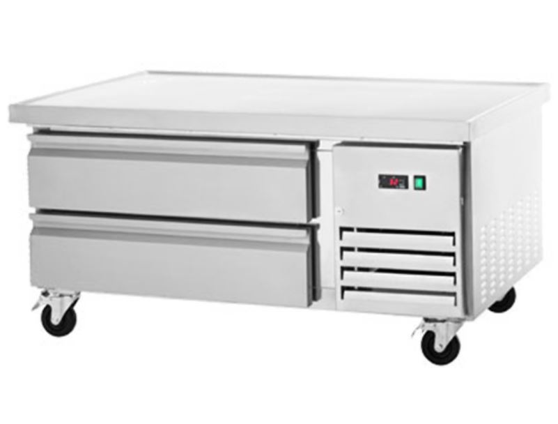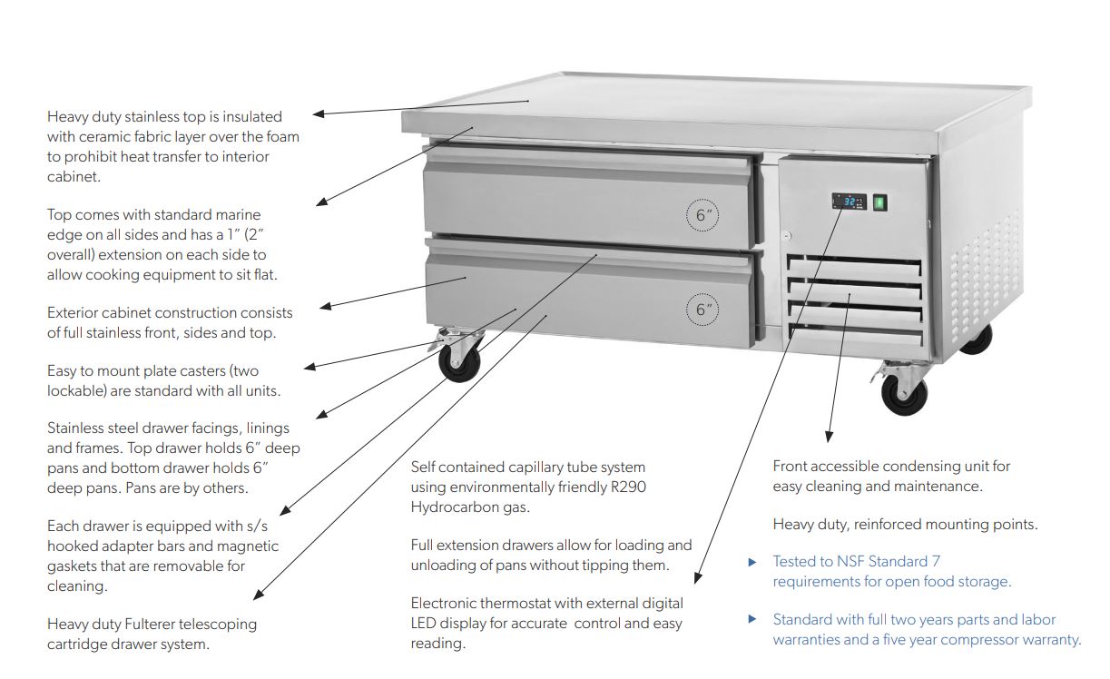 The exterior of our ref. chef base models are beautifully designed in a smooth stainless-steel finish for a professional look that you would find hard to limit in any commercial application. More importantly, our products have many features that are desired in today’s commercial foodservice market. Features that include a sub-layer ceramic mat that heavily reduces the heat transfer from the cooking appliance to the cold cabinet/the foam/and the mechanical compartment…this simple feature provides year-after-year of reliable performance, Fulterer™ heavy-duty/telescoping/cartridge style drawer slides/heavy-duty mounting points/full perimeter marine edge on top/drawer slides that will house 4” deep pans in the top drawers and 6” deep pans in the bottom drawers, high output yet electrically efficient fan motors, electronic micro-processing digital temperature control with external digital display, side mounted compressor along with a front accessible side mounted condensing unit for easy maintenance/cleaning/servicing.