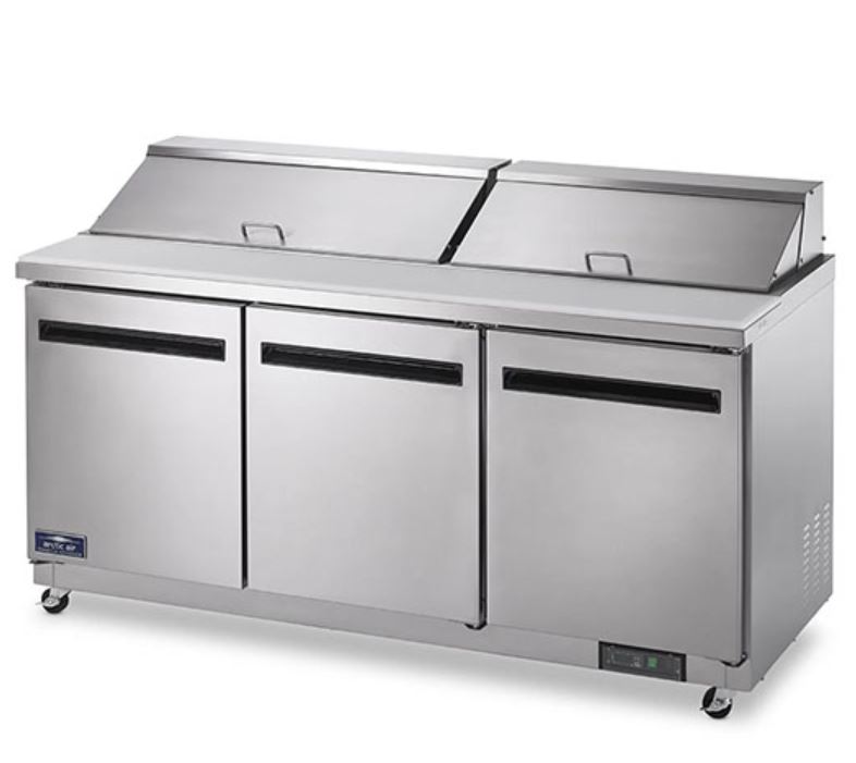 The exterior of our ref. prep table models are beautifully designed in a smooth stainless-steel finish for a professional look that you would find hard to limit in any commercial application. More importantly, our products have many features that are desired in today’s commercial foodservice market. Mega-depth ref. prep tables offer an additional 3rd row of pans, an inner door liner that is constructed of a hi-impact ABS polymer with an irregular shaped surface along with a vaulted design that extends beyond the door opening when shut. This door liner allows the end user lower compressor run times over the life of the unit due to its irregular surface working in conjunction with the vaulted door liner, other features include hi-grade stainless steel floor with coved corners, high output yet electrically efficient fan motors, effective “cool air over” pan-well design assures the end user that the exposed pan well will stay within the legal temp. limits for safety when installed properly, electronic micro-processing digital temperature control with external digital display, bottom mounted compressor along with a front accessible bottom mounted condensing unit mounted on a slide-out rack for easy maintenance/cleaning/servicing.