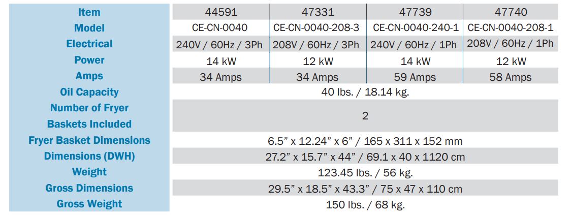 Omcan’s Electric Floor Fryer is designed for best performance while delivering exceptional results. Excellent choice for busy restaurants and fast food businesses. This fryer has a 40 lb. oil capacity. Available in four electrical combinations.