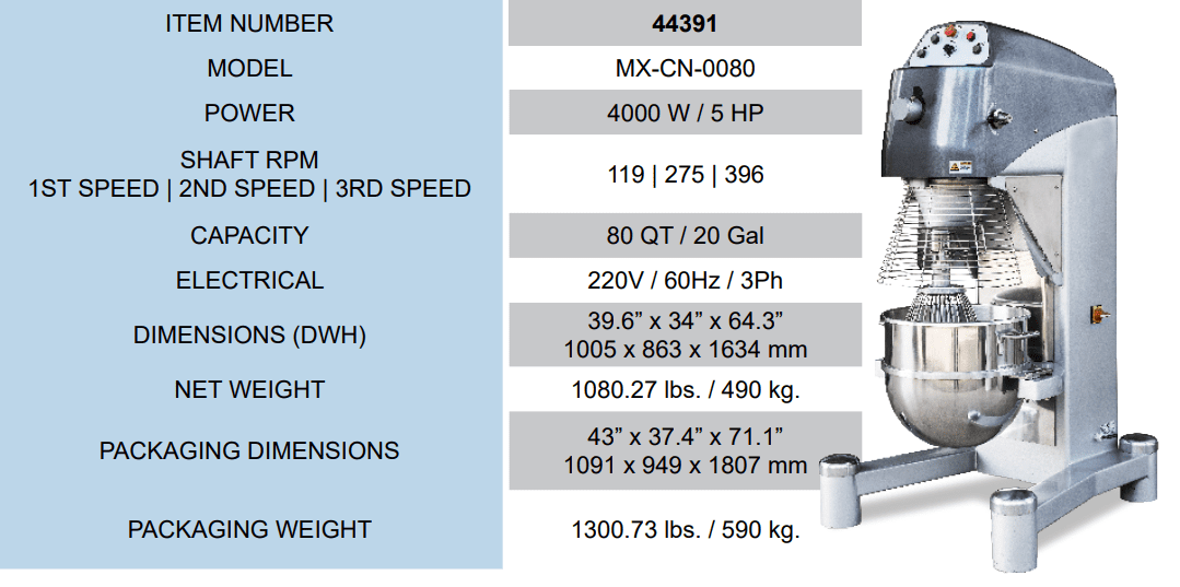 The motor is designed with an overload protection to effectively guarantee long-life service. Heat is spread in axial direction. This baking mixer is equipped with safety features and designed to be resistant to water and humidity. This unit is equipped with a #12 drive hub.