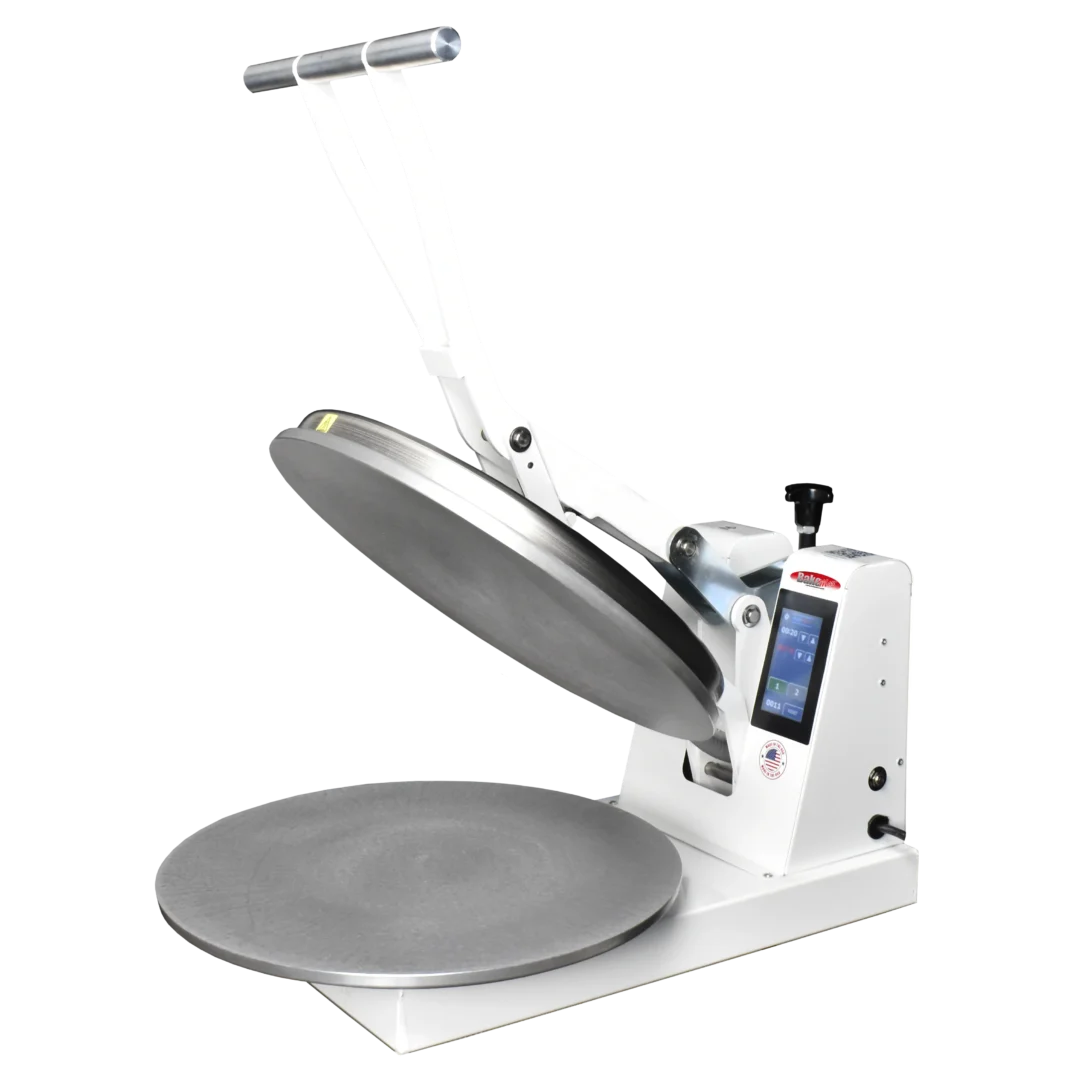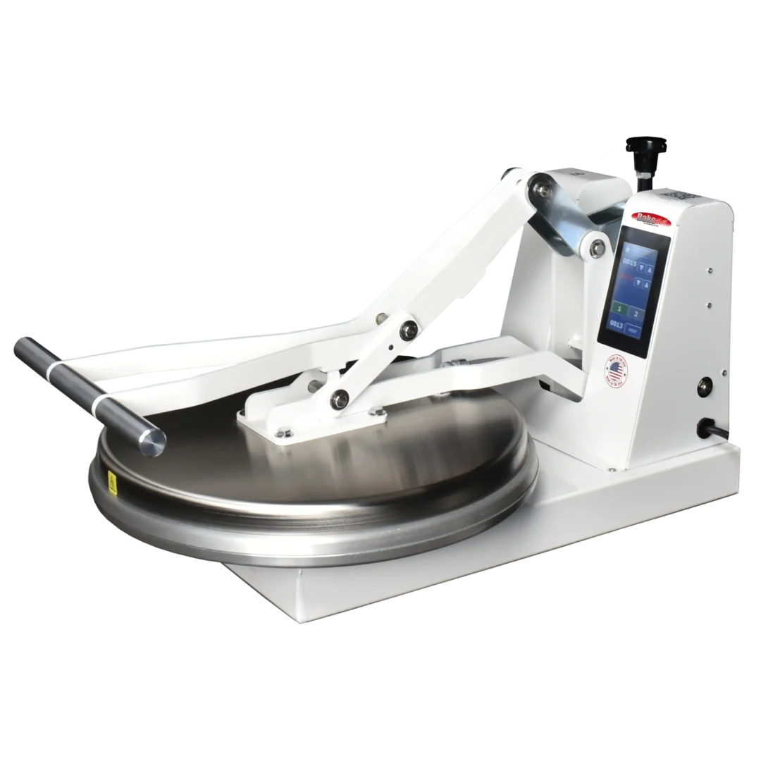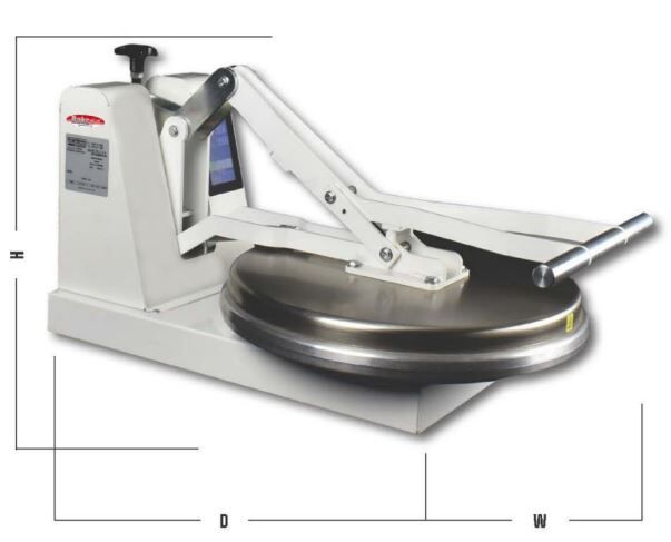 The BakeMax BMDM18 is an economic manual pizza dough press, perfect for low to medium production volumes (75-100/hr). It is a fast, safe, simple, mess free (no flour needed) alternative to hand tossing or sheeting/rolling your pizza dough. The dough press is an easy, affordable way to improve your production time, as well as your finished product. The BMDM18 is a clamshell design with an upper heated platen.