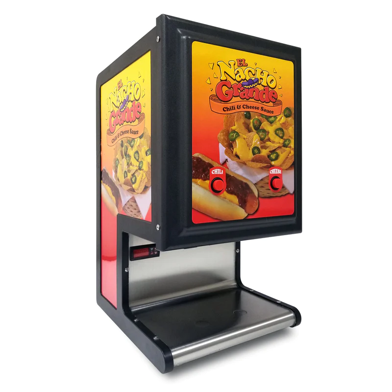 Supreme nachos equal supreme profits! Selling chili and cheese nachos fast and hot is a popular choice for busy self-serve locations. The Dual Cheese & Chili Dispenser #5301 sells both cheese and chili nachos fast and hot. Each side of the dispenser holds one 140 oz. bag and has dual peristaltic pumps to give you the most out of every bag! Try this dispenser at arenas, schools, bars, and more!