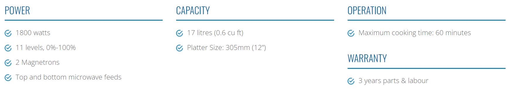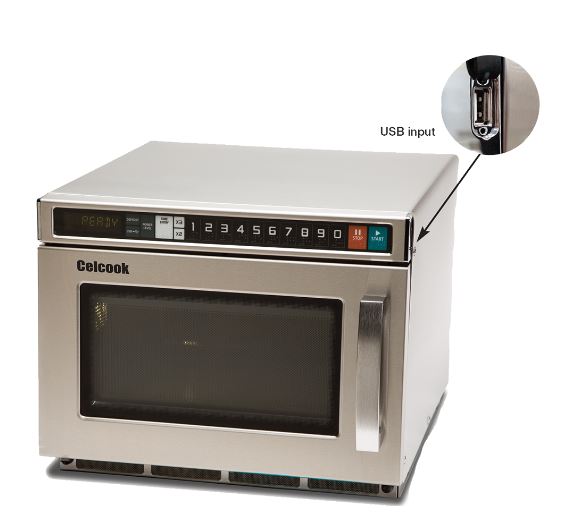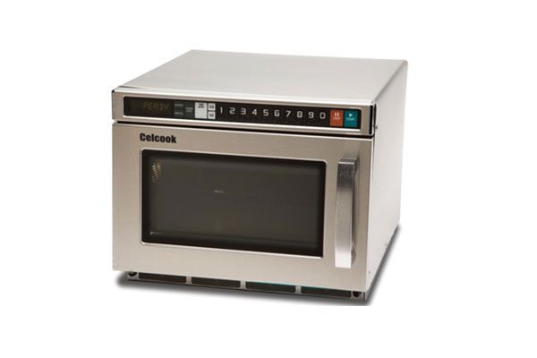 A commercial microwave oven will be equipped with 10 touchpad programmable control panel with the ability to program 100 menu items. The oven will have a maximum cooking time of 60 minutes with 11 power levels, 3 stage cooking and a time entry option. Output wattage shall be 1800 watts with top and bottom rotating antenna feed distribution for a uniform heating pattern. The oven will have stainless steel exterior and the interior cavity with the 17 liters (0.6 cu ft) cavity able to accommodate a 305mm (12”) plate. Ovens will be stackable and include a safety bracket. Removable front filter to protect and cool oven components will have a “clean filter” reminder feature. This ISM apparatus meets all requirements of the Canadian Interference-Causing Equipment Regulations. This ISM device complies with Canadian ICES-001.