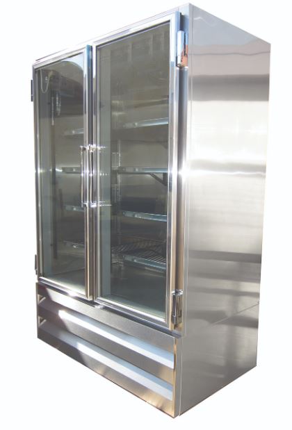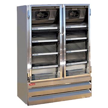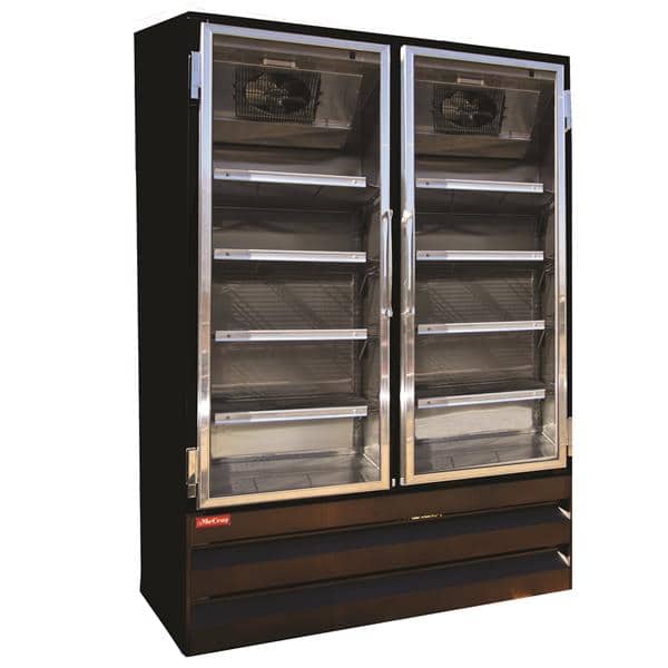 Two sections in the Howard McCray GF42BM-S-LED display cooler have a combined interior space of 42 cubic feet. To reduce temperature loss, the hinged doors are made of glass, providing an interior view without opening them. The interior is brightened with LED lights to catch the attention of customers as they walk by, increasing the possibility of impulse purchases. For durability, the interior and exterior are made of strong, corrosion-resistant stainless steel.