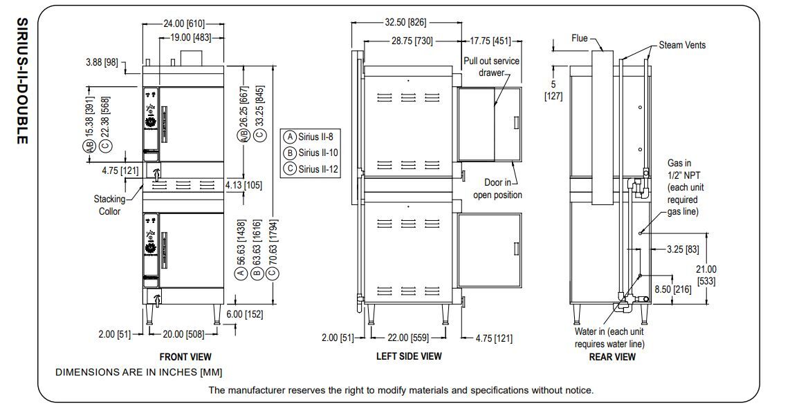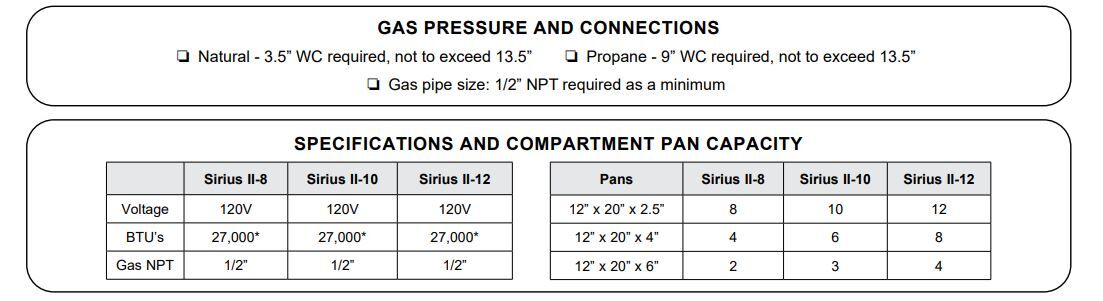The Sirius II is a Market Forge convection/circulating boilerless steam oven with automatic water-fill, featuring internally preheated water for fast recovery, clean water reservoir system, and rear drain. Sirius II models are efficiently heated by electrical elements external to the water reservoir. Four-pan steamers – 27,000; six-pan steamers – 27,000 BTU.