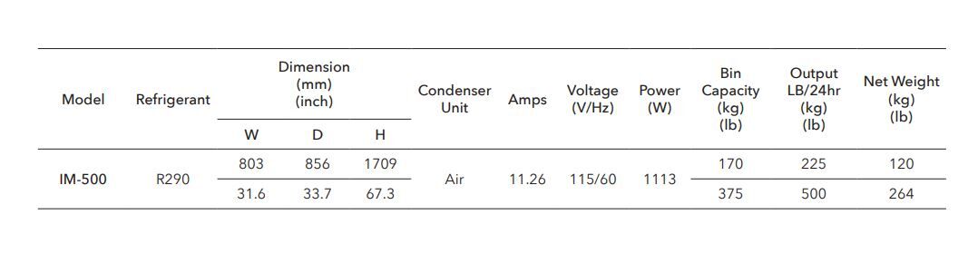 The EFI Cube Ice Machine IM-500 is a robust commercial ice maker capable of producing up to 500 pounds of full-cube ice per day, making it ideal for high-demand environments such as restaurants and bars. This air-cooled, self-contained unit features a 350-pound capacity bin, ensuring ample storage for ice. Designed for durability, the IM-500 boasts a corrosion-resistant exterior and includes a built-in scoop holder for convenience. Its user-friendly design allows for easy maintenance with an easily removable baffle that requires no tools for cleaning. With its efficient performance and reliable output, the IM-500 is an excellent choice for any food service operation.