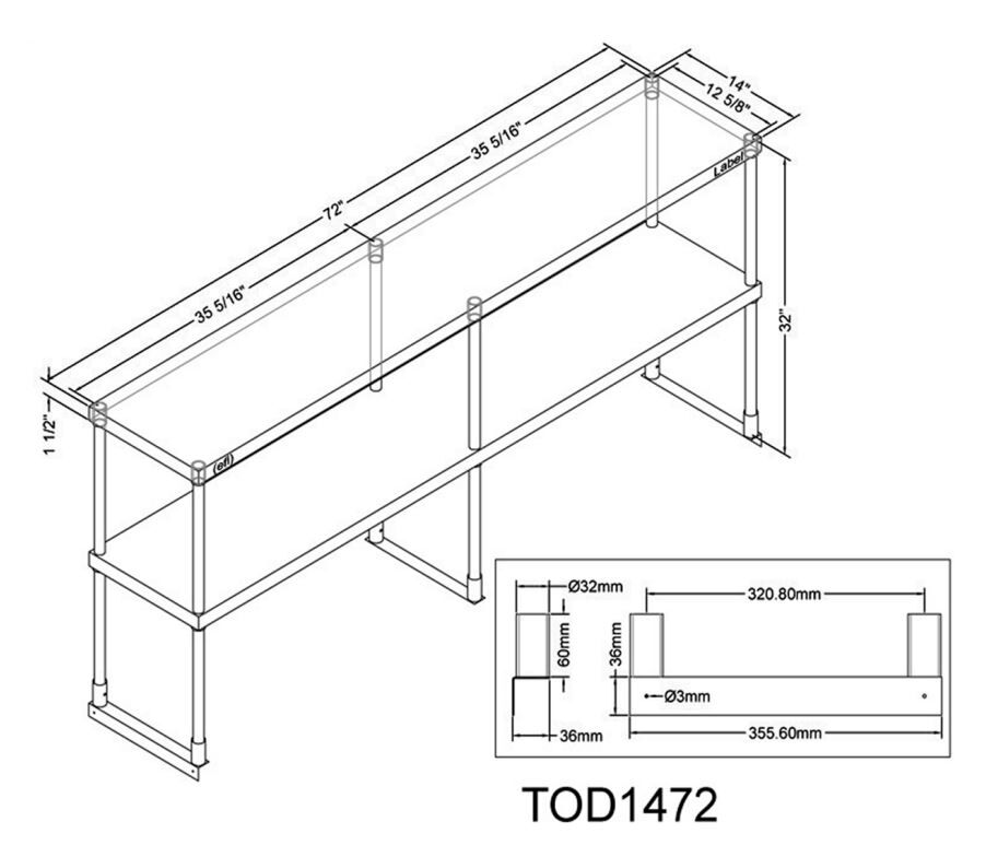 14″ x 72″ 18 Gauge Stainless Steel Double Overshelf TOD1472 Features: