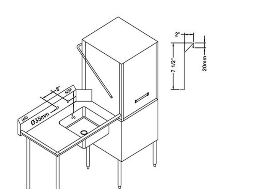 Dish table system consists of soil and clean sections. Table is furnished with a 7½”backsplash and a 2″return.