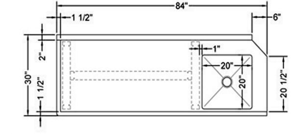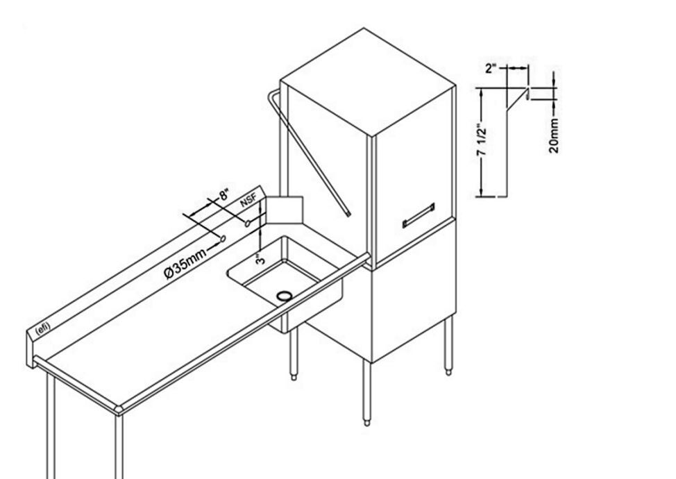 Dish table system consists of soil and clean sections. Table is furnished with a 7½”backsplash and a 2″return.