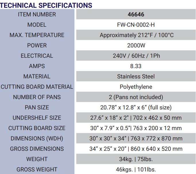 Omcan’s 30-inch stainless steel electric steam table with cutting board and undershelf is the ideal unit for buffet and catering services. This unit is intended for dry use and comes with the option of compatible spillage pans (Item#80907) for moist heat – sold separately. Durably built with stainless steel construction, our food table comes equipped with a convenient undershelf to store essential serving and kitchen tools, as well as a removable cutting board that is easy to clean and extra workspace. Keep all your hot foods consistently warm and readily available!