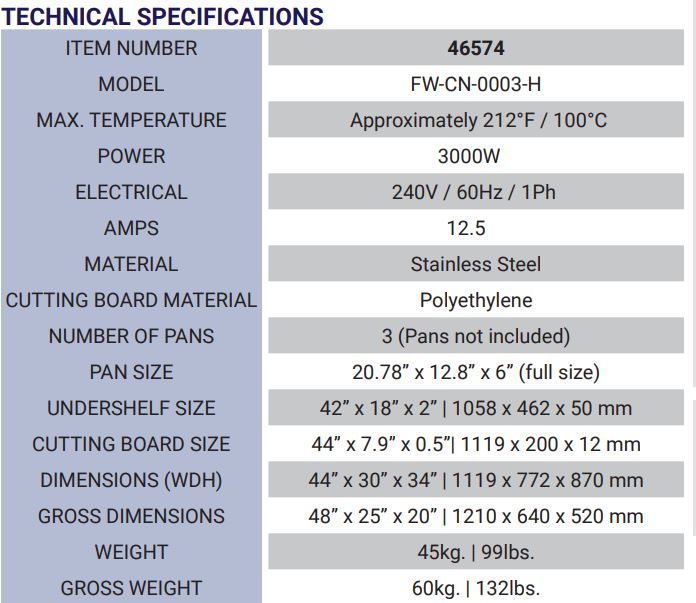 Omcan’s 44-inch stainless steel electric steam table with cutting board and undershelf is the ideal unit for buffet and catering services. This unit is intended for dry use and comes with the option of compatible spillage pans for moist heat – sold separately. Durably built with stainless steel construction, our food table comes equipped with a convenient undershelf to store essential serving and kitchen tools, as well as a polycarbonate cutting board for extra workspace. Keep all your hot foods consistently warm and readily available!